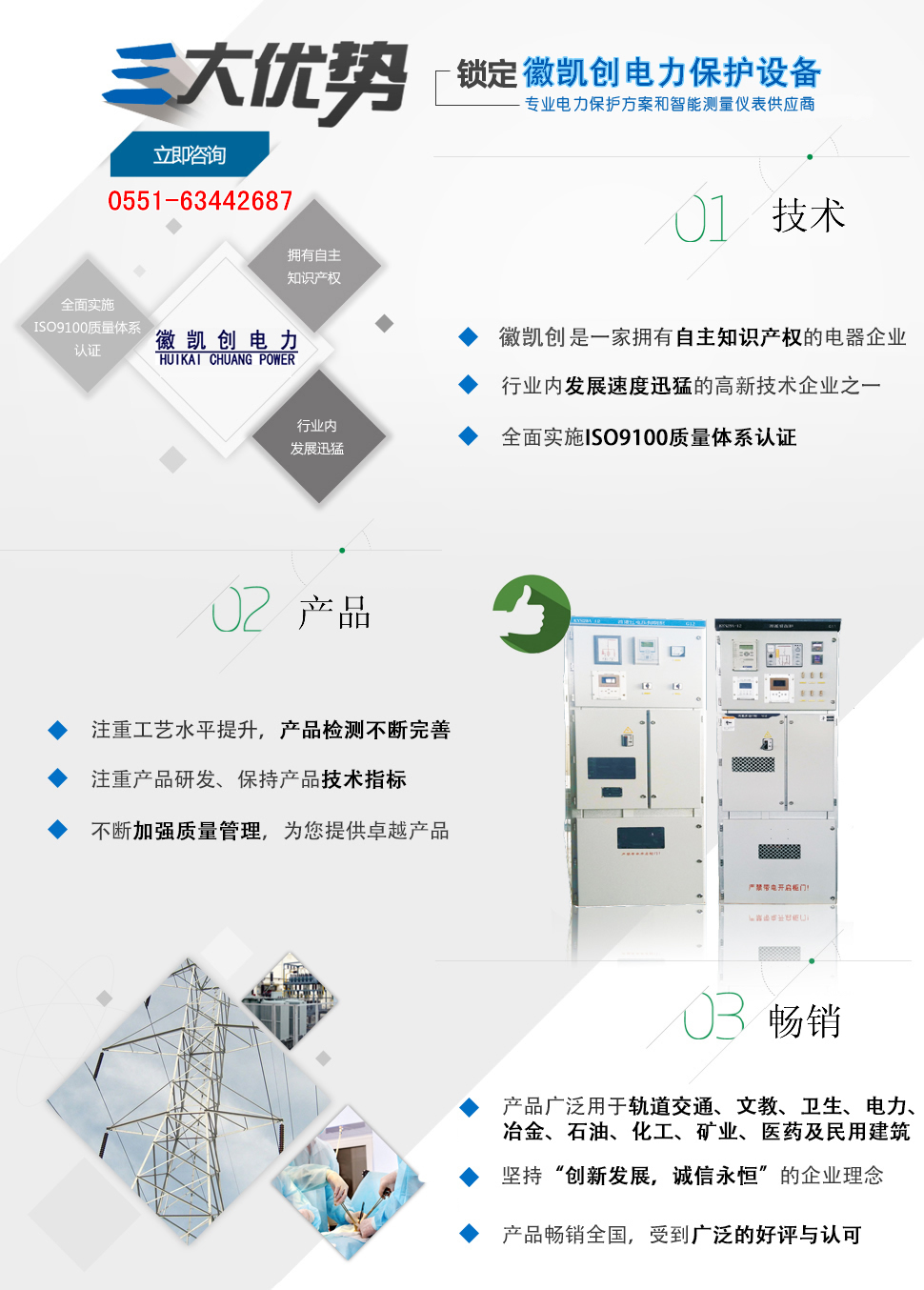 安徽徽凱創電力保護設備有限公司主要從事新型電氣設備、電子設備、智能控制技術的產品研發(fā)、生產、銷售。主要產品有:智能型消弧消諧裝置、消諧過電壓抑制柜、 組合式過電壓保護、智能型開關柜智能操控裝置、微機消諧、小電流選線、電弧光保護裝置、智能在線絕緣監(jiān)測裝置等電氣產品。 產品廣泛用于石化、煤炭、電力、建筑、市政、機場、鐵路、醫院、學校等領域,受到用戶一致好評。
